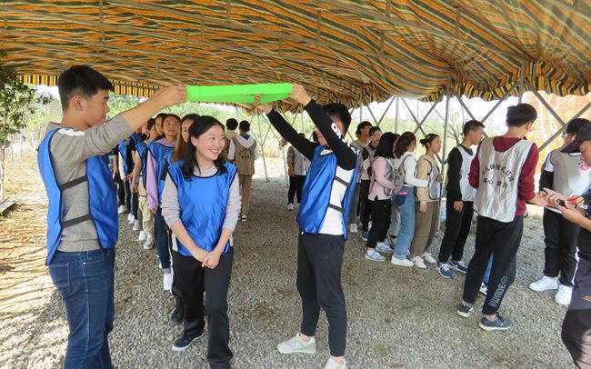 到达户外素质拓展训练场地后,教练对整个队伍进行了分队,带着大家做了一些有意义的小游戏,团队精神初步体现。训练正式开始,同学们进行了“团队破冰”、“蛟龙出海”、“共同进退”、“人工扫描仪”以及“毕业墙”五个项目。“团队破冰”项目中,各小队在15分钟内完成队名、队歌、队旗、队徽,口号、团队造型的选定和创作,在最后的展示中,六个小队创意无限,充分地展示了自己的团队特色。在“蛟龙出海”项目里,各小队进行了绑腿横向前进的比赛,“一二一、一二一……”整齐的口号,响彻在训练场地。在练习过程中,步伐不统一、相互绊倒、踩脚等问题频繁出现,同学们团结一致,最终克服了种种困难,大家也都在比赛中明白了团队协作的重要性。