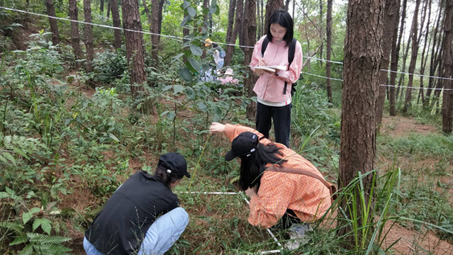 按照见习出发时间和地点的约定,各见习小组准确核对好外出见习工具和个人所需物品后,统一在指导老师的带领下乘车前往了白鹤森林公园。进入公园,登上梯步,同学们在指导老师的讲解下一路来到森林公园中的马尾松林并依照前期的小组分配各自进行了野外生态调查中的植物群落样方调查。