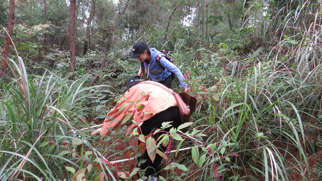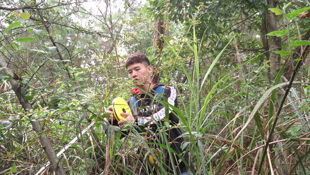 继白鹤森林公园见习调查后,同学们来到北山公园进一步开展第二次不同地区植物群落样方调查和地表无脊椎动物调查。步行至可调查地段,指导老师依旧将见习小组分配在不同地点进行样方调查。此次调查,同学们借助木棍,携带工具深入林中。其中一组见习成员,在选择较为平坦的地方后,拉起样方,一一识别植株,测量统计相应植株高度。芒、淡竹叶、求米草、白背枫、地桃花、算盘子、楤木、松木等各种草本,灌木,乔木植物被录入同学们的见习数据统计表中。完成第二次植物群落样方调查后,指导老师带领同学们在绿化带中借助扫网法捕捉地表昆虫。