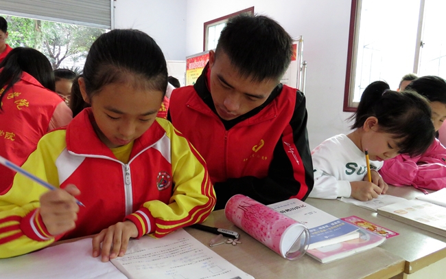 课前,志愿者们摆放桌椅、打扫卫生,并对提前来到现场的小朋友们进行了作业辅导,认真解答小朋友们在学习中遇到的难题。