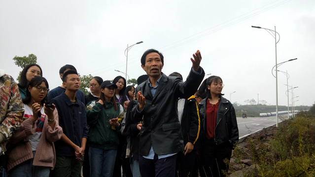 从学校南大门出发,2018级全体同学在相应指导老师的带领下分两大见习小组按照既定路线,分别乘车前往见习目的地。行至见习第一站—“回龙湾,李武斌老师向同学们详细介绍了该处的岩层分布与具体的岩石类别,“灰岩、“沙岩、“粉沙岩等。岩石成分介绍后,李老师带领同学们进行了地质罗盘的实践操作,让同学们在实际运用的过程中学习并熟悉其使用方法。紧接“回龙湾的后续两站“潘家湾,徐家大院,李老师也继续为同学们介绍了滚石,滑坡,塌方的如何形成以及岩层中夹杂物质的主要成分等。