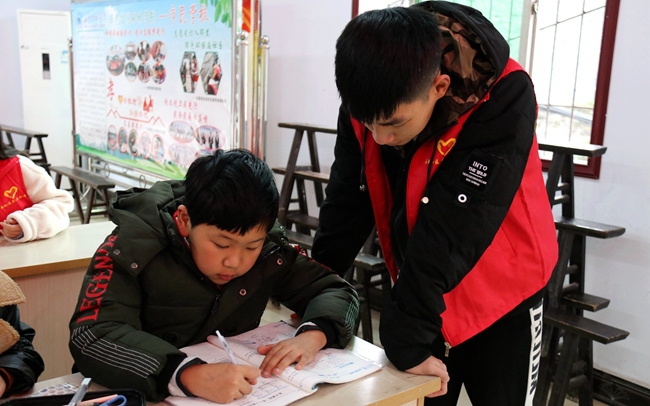 在到达学校后,志愿者们开始布置教室,并安排提前到来的小朋友入座,给他们进行了作业辅导。随后是自由活动时间,小朋友和志愿者一起下象棋,打羽毛球,操场上充满着孩子们的欢声笑语,其乐融融。