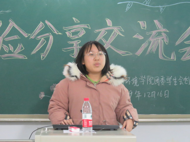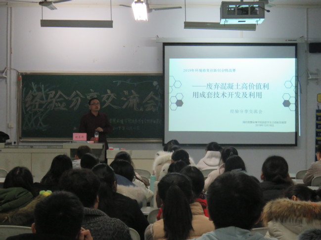 随后,17级环境科学2班高纯同学从“比赛掠影”、“项目技术”、“我的团队”和“我的感受”四个方面来讲解此次环境修复创新创业挑战赛。在项目技术中,废弃混凝土高价值技术开发及利用的项目展出了复合微生物融合凹凸捧土修复,环境土壤污染基于人工智能、数值仿真和大数据技术的环境灾害治理和污染检测评估服务,还有超积累植物萃取+稳定化联合修复。高纯同学通过此次挑战赛总结出来两句话,一是“见贤思齐”,告诫同学们应该要向优秀的人学习;二是“你若盛开,清风自来”,引导同学们努力让自己变得优秀。环境科学专业2018级1班陈龙雨同学向19级同学分享在创新创业挑战赛中的收获,并激励他们在将来的学习生涯中向优秀的人看齐,加倍努力学习。