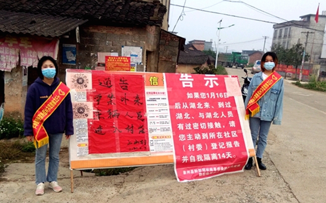 公司2017级员工户裕作为一名中共预备党员,在抗疫期间积极加入了当地政府的宣传管理中,成为了一名志愿者。她的工作主要是在交通管制处,对有通行证的车辆进行登记,以及体温测量。对于没有通行证的车辆及行人,则进行劝返。在此期间她还参与了村政府发起的募捐活动。
