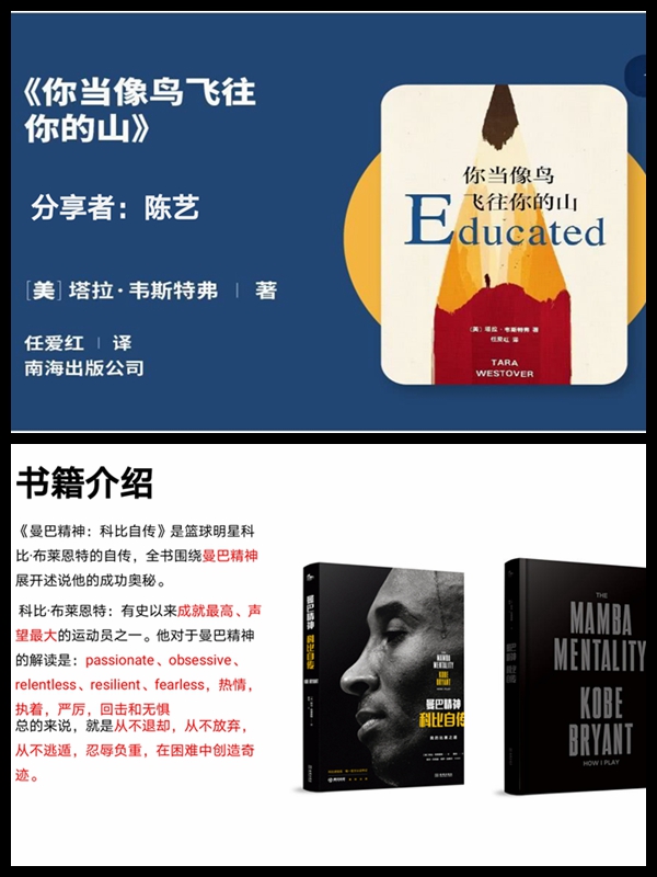 首先,主持人给大家宣读了比赛规则和评分标准。接下来是选手分享环节,每位选手有3-7分钟的时间进行分享。1号选手陈艺同学给大家分享的图书是《你当像鸟飞往你的山》。首先,陈艺同学为大家简单介绍了这本书的作者,让大家对这本书的产生背景有了初步的了解,之后,陈艺同学通过目录,为大家详细介绍了这本书的大意。最后,通过作者塔拉的经历和采访,让大家了解了这本书的内涵,同时也对写作背景有了更深入的了解。而13号刘旭东同学为大家介绍的图书——《曼巴精神:科比自传》,是篮球明星科比•布莱恩特的自传,刘旭东同学给大家分享了在“篮球天才”光环下的科比的认真、不服输,让大家了解到了不一样的科比。