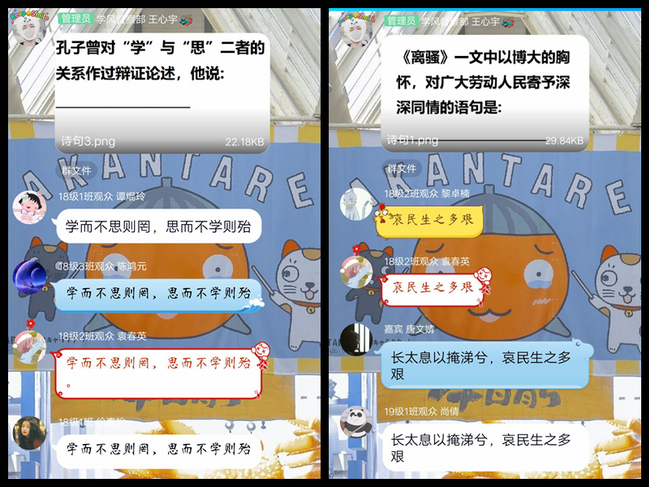 比赛期间,为了活跃气氛,增加观众参与度,进行了现场观众互动答题部分:看图猜成语、诗句填空,大家踊跃发言,积极讨论,比赛气氛活跃。