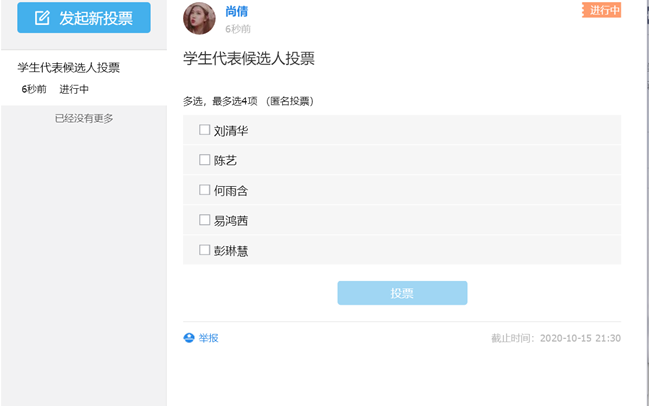据悉,这些候选人经过各班同学推荐选拔出来,每个候选人都是优秀的代表。 最后,活动公示了投票选举结果。此次线上活动的进行,以无记名投票的形式,保证了此次活动的民主性、严肃性。 通讯员:王丹 |