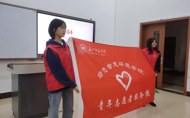 主持人宣布授旗仪式开始。由服务团前成员熊海洪为服务团成员授旗。 “我志愿成为一名光荣的志愿者,我承诺:尽己所能,不计报酬,帮助他人,服务社会,践行志愿者精神,传播先进文化,为建设团结互助、平等友爱、共同前进的美好社会贡献力量。”这是青年志愿者的誓词