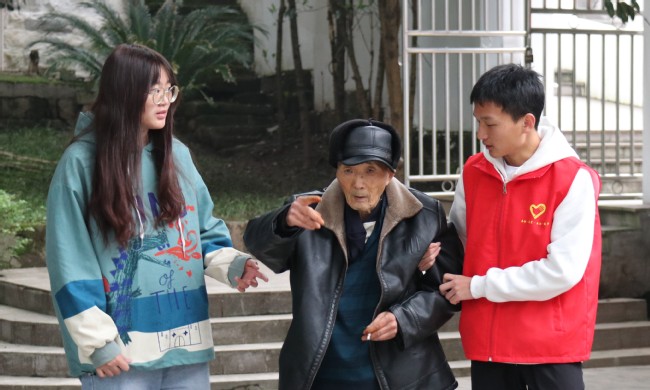 活动开始前,一名到访的老人由志愿者引领,参观了市民小学。