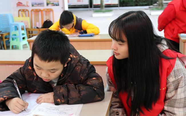 到达目的地后,志愿者们开始布置教室并组织小朋友入座,之后便为到来的小朋友解决课业上的难题,无论是志愿者还是小朋友都从中收获满满。