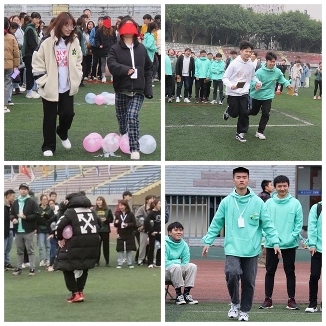盲人旅行要求每两人一组,共十四人参加,参赛者需蒙眼跨过障碍物,并且指挥者、过障碍者与障碍三者之间不能有接触,这不仅考验参赛双方的信任,更考验默契度;平地而起是十人团队作战,开始由两人坐在平地上,仅靠背部的力量从平地上站起,之后每次加入两人重复之前的做法,直至十人成功站立,同学们的反应力和团队合作能力都在这个项目中得到锻炼。