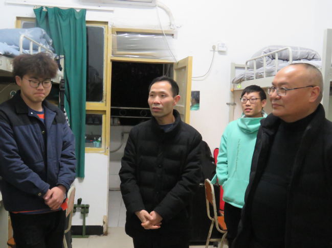 况守龙书记慰问了外地同学在学校的生活现状,是否能够适应重庆的天气,关心同学们的身体健康和冬天衣物上的保暖工作,提醒了同学们期末的重要性并要求同学们认真的准备期末考试,以及注意寝室的用电安全,提高自身的安全意识,做到零损失、零伤害。