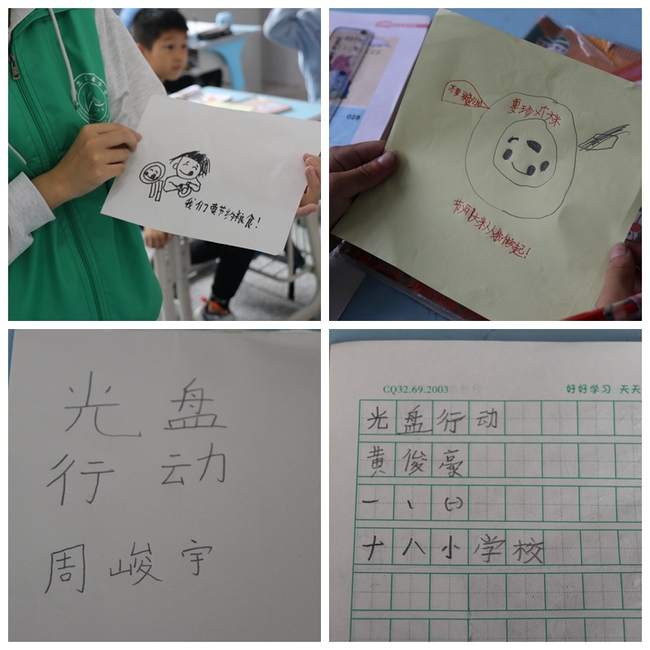 为了让大家更深刻地认识到爱惜粮食、勤俭节约的重要性,志愿者讲解一粒种子从生根发芽到开花结穗的生长过程,以及耕种、施肥、浇水、收获的漫长劳作,让孩子们体会到了农民伯伯种植作物的辛苦,了解到了粮食的来之不易。在课堂中,志愿者让高年级的小朋友参与设计了光盘行动的宣传海报,低年级的小朋友则是摹写“光盘行动”四个字,大家积极参与,绘画本、写字本上很快就布满了小朋友们的奇思妙想,志愿者一一展示了他们的作品。