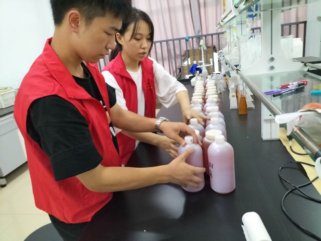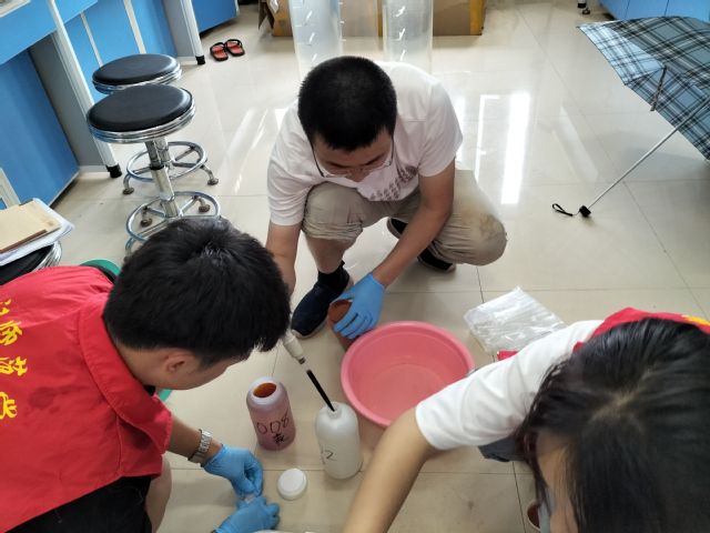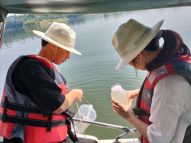 8月4日,为研究长寿湖水体中的水生植物生长状态,了解水体的水质情况,对其中生长的水生植物进行种类调查,服务团一行人来到长寿湖周边进行调研,听取长寿湖周围居民对湖水水质的评价。8月5日,为观察湖中浮游生物生长情况,四人再次前往长寿湖,乘船进行湖水和湖底淤泥的采样;再将样品运送至实验室进行固定及静置,最后通过显微镜观察鉴定湖中浮游生物的数量、种类等。
