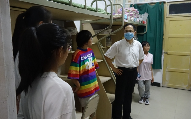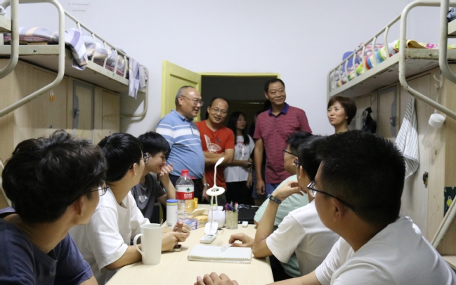 在学院领导、老师看望新同学的过程中,学校米永生副董事长同相关职能部门老师也来到公司新生寝室看望关心同学们。米副董事长尤其看望了公司特情新同学,亲切勉励自强自立,希望学院、相关部门和同室同班同学对其提供力所能及的帮助。