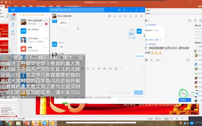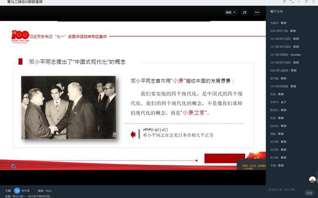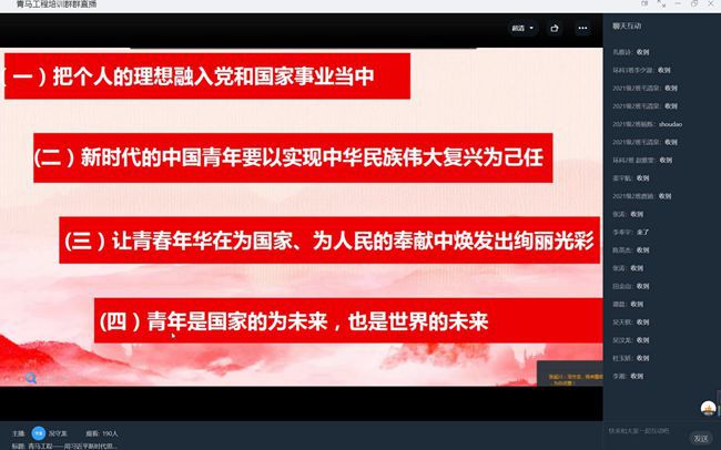 在直播开始前,同学们做好了充足的准备,积极准时地进入党课直播。在直播开始后,况书记以PPT的形式引领着同学们学习党课,条理清晰的讲述配合着详细丰富的课件使线上直播变得生动。同学们也在直播讨论区中积极地进行互动。