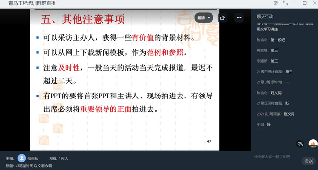 线上讲座开始,包老师首先谈到新闻的定义与特点,以及新闻六要素,再讲到了新闻报道的结构,并强调了新闻主体需主干突出、内容充实、结构严谨、层次分明。随后包老师在谈到了新闻语言的时候,要求同学们学会并运用客观、确切、简练、朴实、通俗的新闻语言,这样既能让读者清晰明了地理解新闻的内容,亦可展现活动的亮点和特色。通过老师对新闻报道写作细致的讲解,同学们了解到了如何书写日常的新闻,让同学们对新闻写作进行了整体性学习与了解。