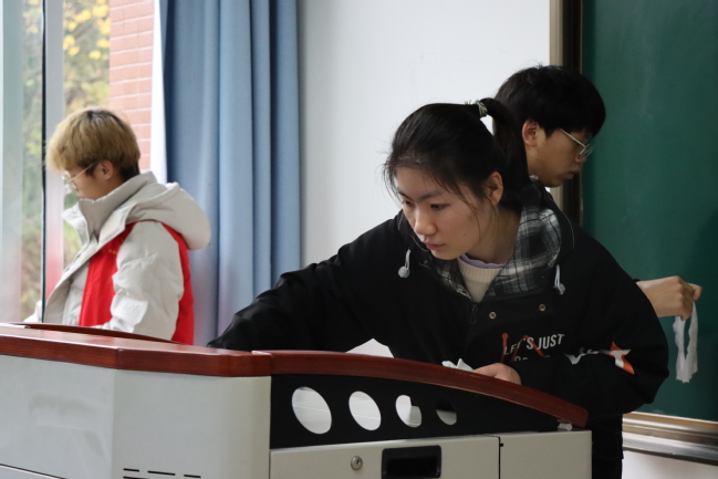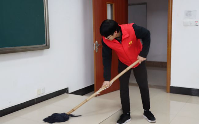 活动伊始,志愿者们井然有序的进行分工合作,各自进入安排好的场地后,每个人都热情积极的做好自己的工作。一些人拿着抹布弯着腰,细致的擦着窗子、桌子和讲台,清洁黑板粉尘,他们擦过的窗户锃光发亮,桌子与讲台变得纤尘不染。连桌脚、椅背等细微之处也毫不放过。或是有的人拿着扫把和拖把反复的来回清扫,教室的每一处经过他们的打扫都变得一尘不染。