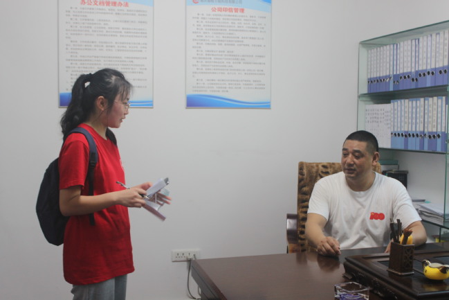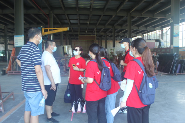 企航小分队第一站去往了重庆驰程节能科技有限公司。该公司是以生产加工建筑和家装玻璃为主业的一家小型企业。首先,在公司负责人黄总的带领下,小分队参观了玻璃门窗、玻璃幕墙等的生产工艺流程。之后通过对黄总的访谈,切实了解了龙桥社区对企业的服务情况。主要体现在:一是积极协助企业做好疫情防控。社区定期开展疫苗接种,并严格监督企业消毒杀菌。二是协助企业做好安全生产。社区通过举办安全生产专项培训会、线上宣传等方式提高企业的安全生产意识和技能。三是热心为企业提供优质服务。“企业有所求,社区有所应”,对于企业运营中遇到的一些流程复杂、手续繁琐的行政审批事务,社区积极协助代办或与有关部门进行协调,全方位为企业提供高效服务。