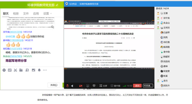 面对重庆市疫情防控关键的时期,公海gh555000aa线路检测中心教师党支部积极响应中共重庆市委组织部的号召,动员党员教师立足实际,参与校园疫情防控工作。活动中,肖红艳同志和陈韶军同志分别就参加疫情防控的体会做了分享。他们提到,党旗所指,行动所向,冬天的凉意渐渐来袭,但作为一名党员教师,更要以身作则、冲在前面,为抗击疫情贡献出自己的一份力量。活动最后,解书记提醒各教师党员,关注员工的心理状态,并注意疫情期间的舆情控制,守护好我们的校园,力争尽快打赢这场疫情歼灭战。