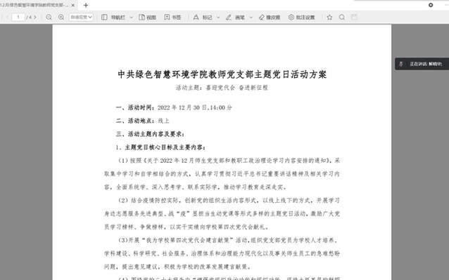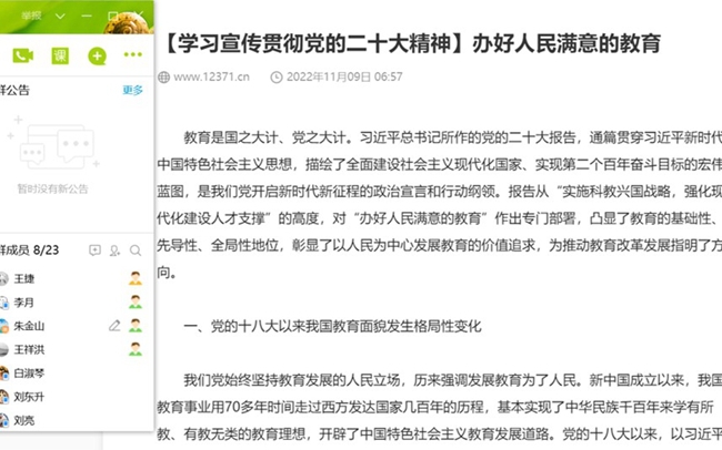 活动开始,主持人简要地介绍本次主题党日活动目标、内容及其安排。接着,全体教师党员集体学习了孙春兰副总理关于“办好人民满意的教育”的讲话,明确了要坚持为党育人,为国育才。在办学中要坚持立德树人的根本任务,坚持科学的教育理念,坚持教育的生命线,培育出党和国家需要、对社会有用的人。与此同时他们认真研习了二十大精神、习近平总书记关于教育的重要论述。