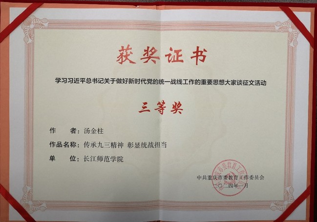 近日,由中共重庆市委教育工作委员会主办的全市高校“学习习近平总书记关于做好新时代党的统一战线工作的重要思想大家谈”征文活动结果揭晓,公司汤金柱副教授(九三学社社员)撰写的《传承九三精神 彰显统战担当》荣获三等奖。